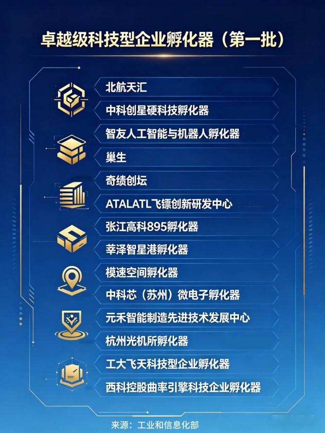 近日,工业和信息化部发布首批科技型企业孵化器名单,其中标准级402家、卓越级14家。孵化器认定工作根据《工业和信息化部科技型企业孵化器管理办法》要求,按照“做优存量、做强增量、分类培育、提升能级”的思路开展,旨在通过精准赋能推动孵化器高质量发展,促进科技成果转化和企业孵化,助力传统产业升级、新兴产业壮大、未来产业培育。具体分为标准级和卓越级两类孵化器,分别实行达标认定和对标国际一流择优认定,标准级