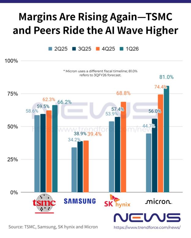 台积电在第一季度录得净利润新高后,管理层预计2026年第二季度营收将在390亿美元至402亿美元之间,同比增长约32%,环比增长约10%。在盈利能力方面,假设汇率为1美元兑31.7新台币,公司预计毛利率将在65.5%至67.5%之间,营业利润率预计在56.5%至58.5%之间。 首席财务官黄文德表示,在更高的产能利用率和持续的成本优化支撑下,预计本季度毛利率将进一步提升,但海外工厂扩张会部分抵消这