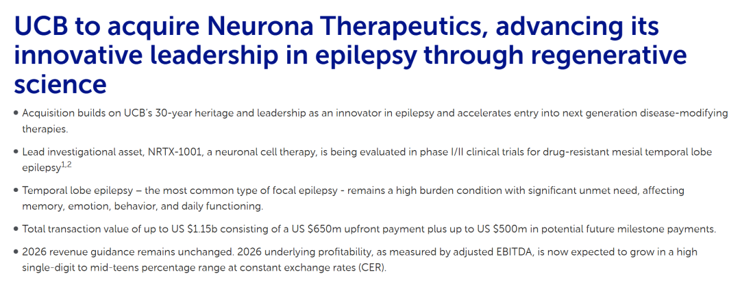注:本文不构成任何投资意见和建议,以官方/公司公告为准;本文仅作医疗健康相关药物介绍,非治疗方案推荐(若涉及),不代表平台立场。任何文章转载需得到授权。4月17日,全球生物制药公司UCB宣布已达成最终协议,将收购Neurona Therapeutics及其核心资产NRTX-1001,以扩充UCB的抗癫痫产品组合。Neurona Therapeutics是一家处于临床阶段的生物治疗公司,专注于开发针