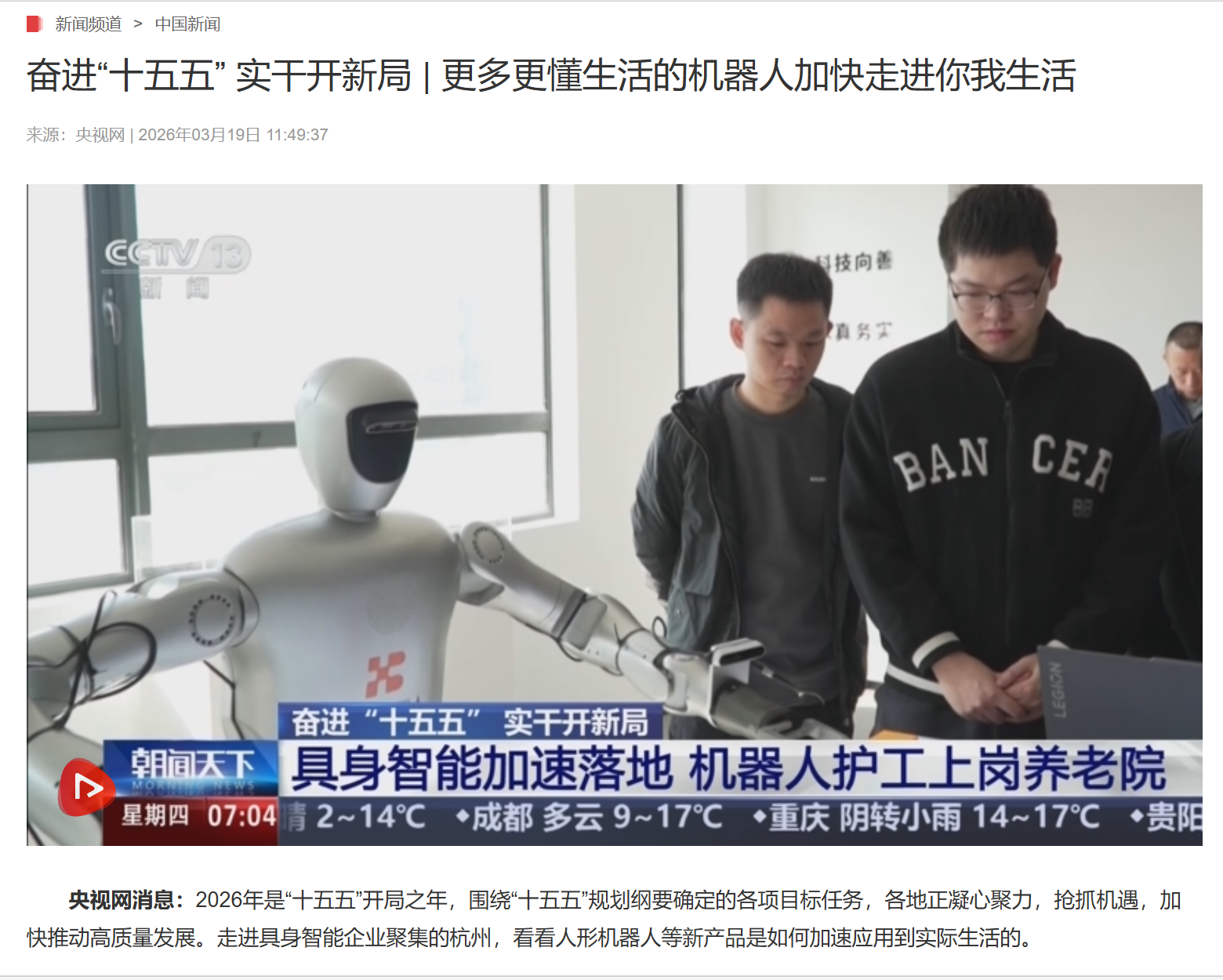 2026年3月19日,央视网报道了主题为“奋进‘十五五’实干开新局”的新闻,聚焦具身智能技术的落地应用。画面中,一款银灰色人形机器人正伸出机械臂,与工作人员进行交互展示,直观呈现了机器人在养老护理等生活服务场景中加速应用的新图景。 同样,全国首个具身康养机器人实训场在青岛刚刚建成,机器人在真实场景中反复训练,力求“上岗即好用”;北京亦庄的智慧康养机器人养老驿站,艾灸机器人、外骨骼机器人、下棋机器人