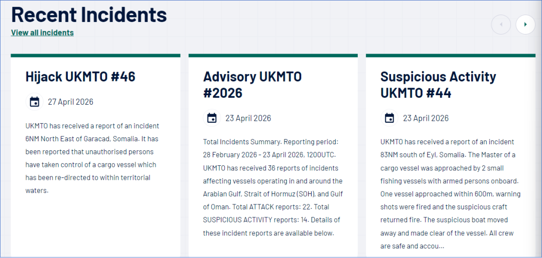 航运界网消息,索马里海盗卷土重来,当地时间4月27日,英国海上贸易行动办公室(UKMTO)发布46号安全通告称,在索马里加拉卡德东北6海里处发生劫船事件,“未经授权人员”控制了1艘货轮,并驶向领海。与此同时,当地时间4月23日,英国海上贸易行动办公室发布44号安全通告称,收到一份关于索马里埃勒东南83海里处发生可疑事件的报告。1艘货船船长报告称,有2艘小型船只接近该轮,船上有武装安保人员。货船在其