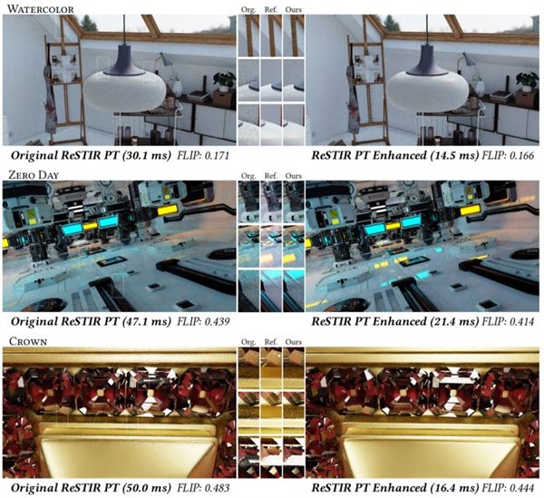 快科技4月21日消息,据报道,英伟达于近日发布了一篇名为《ReSTIR PT Enhanced》的研究论文,提出一种增强版时空重要性重采样(ReSTIR)算法,可将实时路径追踪的渲染性能提升至原始算法的2至3倍。其实,ReSTIR并非一项从零开始的全新技术。英伟达早在2020年就推出该算法。而此次发布的增强版ReSTIR,正是在这一成熟框架基础上的大规模工程优化。在四个不同几何与材质复杂度的测试场