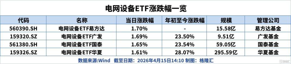 电网设备上涨,电网设备ETF易方达、电网设备ETF广发、电网设备ETF国泰、电网设备ETF华夏上涨。电网设备ETF易方达跟踪恒生A股电网设备主题指数,聚焦输变电设备、电力电子及自动化、线缆以及输变电设备等行业,成份股囊括特变电工、国电南瑞、思源电气等,是全市场唯一低费率(综合费率0.2%/年)聚焦电网产业的ETF。电网设备ETF华夏作为全市场唯一一只跟踪中证电网设备指数的ETF,指数成分股的行业分