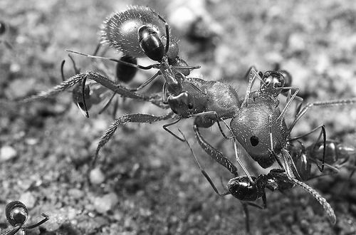 多尔米蚁正在为体形较大的红色收获蚁清洁身体。蚂蚁会与其他昆虫建立合作关系,例如保护蚜虫以换取食物,但它们对其他种类的蚂蚁几乎都具有攻击性。因此,当观察到两种蚂蚁相处得十分融洽时,昆虫学家Mark Moffett感到十分意外。其中体形较小的蚂蚁似乎在为体形较大的蚂蚁清洁身体,可能还会清除并吃掉有害细菌或微小寄生虫。Moffett在4月12日发表于《生态学与进化》的一篇论文中提出,这种罕见行为是蚂蚁之