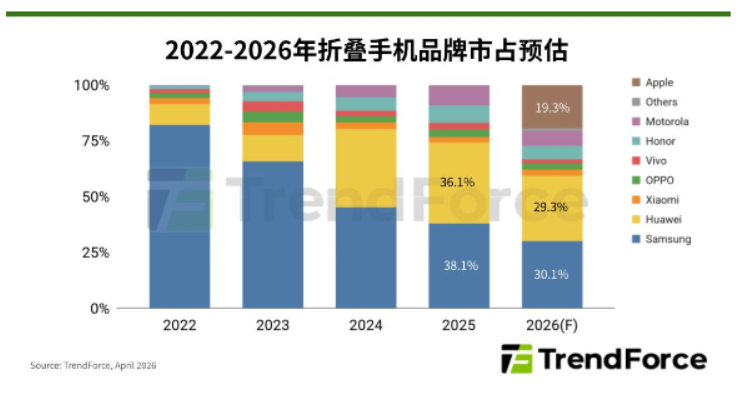 April 13, 2026 ---- 根据TrendForce集邦咨询最新显示产业研究,折叠手机市场最快将于2026下半年迎来Apple(苹果)入局,引发外界关注相关技术革新。其中,面板折痕的优化,正从以往依赖铰链与支撑结构的“机械对抗”,转向以材料堆叠为核心的“应力管理工程”,折痕处理已成为衡量品牌显示技术整合能力的核心指标。 TrendForce集邦咨询预估,Apple凭借品牌形象与消费者的