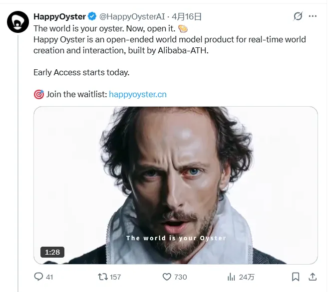 2026年4月16日,阿里巴巴正式官宣全新AI视频大模型Happy Oyster,面向全网开放体验。作为阿里自研重磅长视频生成产品,一经上线便引爆AI文娱、短视频、短剧创作全行业热议。 依托阿里底层大模型技术积淀、多模态算力优势与影视工业化算法优化,Happy Oyster打破现有AI视频时长短、画面抖动、逻辑断层、人物崩坏等行业痛点,实现高质量长时序AI视频稳定生成,彻底重构短剧、影视、宣传片、
