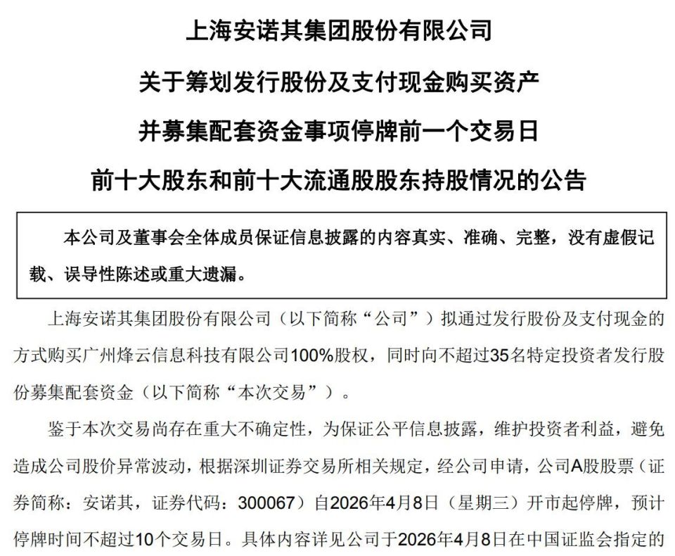 每经记者:文多 每经编辑:魏文艺主营精细化工的上市公司安诺其(SZ300067)进一步切入AI(人工智能)和算力赛道。4月20日晚间,安诺其公告称,公司拟通过发行股份及支付现金的方式,收购广州烽云信息科技有限公司(以下简称“烽云信息”)100%股权。图片来源:安诺其公告烽云信息是一家算力与网络综合服务商,其客户名单中不乏字节跳动、阿里巴巴、腾讯、快手、网易等国内互联网巨头。本次交易中,交易对方之一