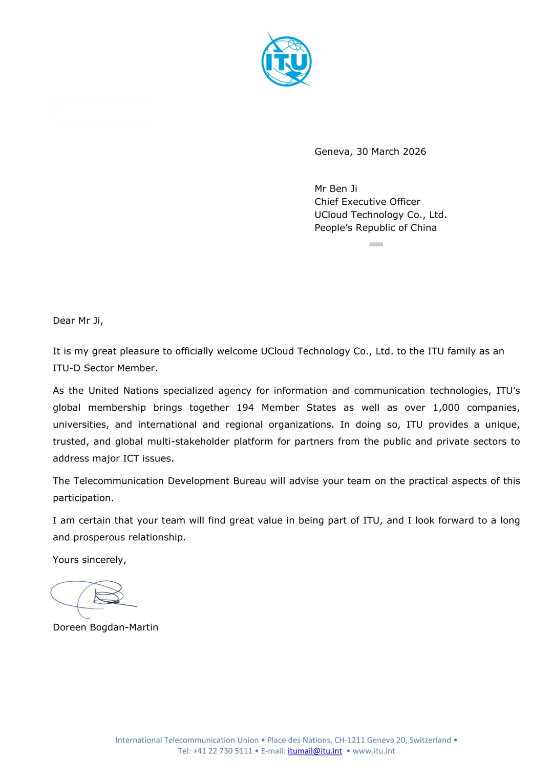 优刻得UCloud正式通过中国工信部审核,并获联合国国际电信联盟(ITU)批准,成功加入其发展部门——ITU-D。标志着优刻得在全球数字经济领域的能力与贡献获得国际权威组织认可。 ITU发函欢迎优刻得成为成员单位 深度融入全球数字体系,参与国际标准制定 作为联合国系统下负责信息通信技术(ICT)事务的核心机构,国际电信联盟ITU长期致力于推动全球数字基础设施建设、缩小数字鸿沟以及促进数字经济普惠发