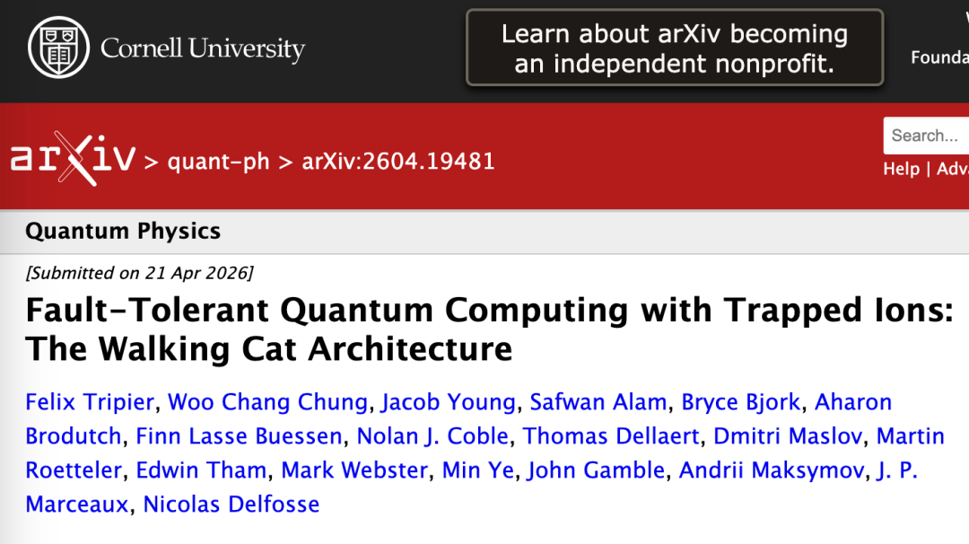 4月21日,量子计算上市公司 IonQ 研究团队正式发布了一份名为“ Walking Cat ”的容错量子计算机完整工程蓝图,详细规定了从编译器、逻辑纠错到量子芯片微架构的所有细节。蓝图指出,仅需2,514个物理量子比特即可构建出拥有110个逻辑量子比特的系统,并每天执行约一百万次逻辑门(T门)操作。01. Walking Cat 架构要看懂这份蓝图,我们得先拆解一下 “Walking Cat”,
