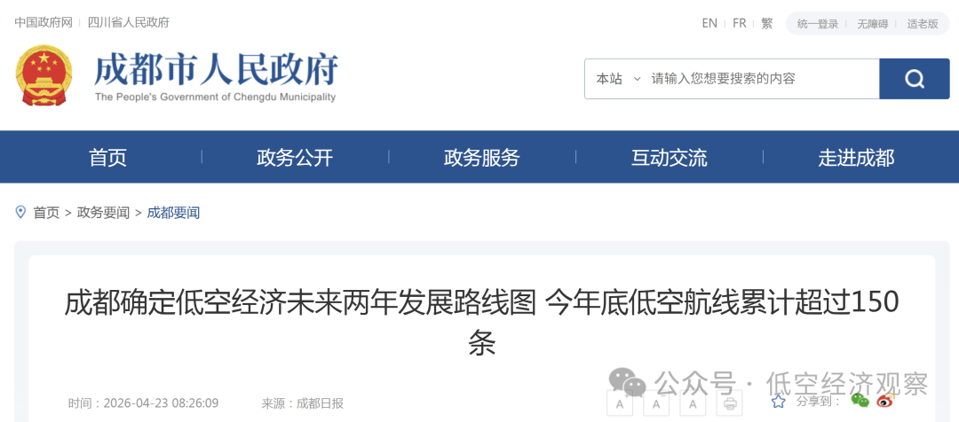 ■ 4月23日「低空经济观察」获悉,成都连发两份低空经济相关文件——《2026年成都市低空经济产业链发展工作要点》(以下简称《要点》)与《成都市有序拓展低空经济应用场景实施方案(2026—2027年)》(以下简称《方案》),为成都低空经济未来两年发展划定清晰路线图,涵盖产业规模、场景落地、空域改革、安全保障等多个方面,推动产业有序发展。《要点》提出,到2026年底,全市低空产业规模达到450亿元、