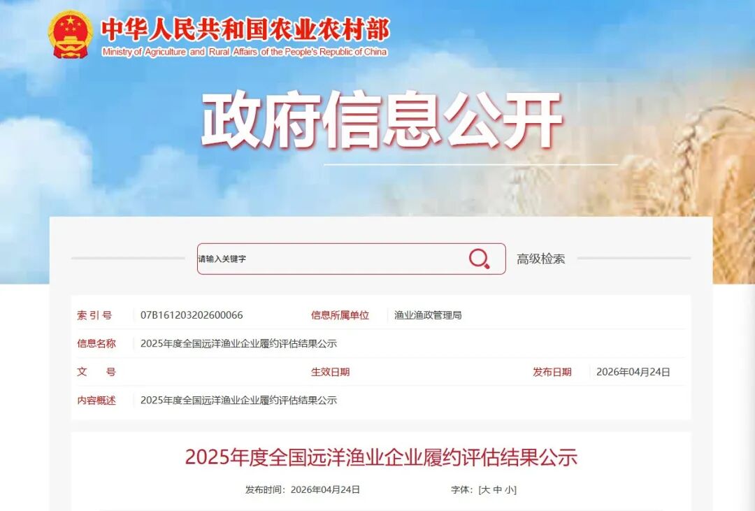 2025年度全国远洋渔业企业履约评估结果公示为持续提高远洋渔业履约能力,促进我国远洋渔业高质量发展,根据《农业农村部办公厅关于全面实施远洋渔业企业履约评估工作的通知》(农办渔〔2021〕22号)要求,农业农村部渔业渔政管理局组织对全国166家远洋渔业企业2025年度履约情况进行了综合评估。经企业自评、省级主管部门初评、农业农村部渔业渔政管理局会同有关单位会商审核后,现将2025年度履约评估结果予以