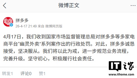 IT之家 4 月 17 日消息,市场监管总局今日通报,针对部分电商平台存在“幽灵外卖”问题,即商家利用虚假证照、套证、一店多开等方式违规开展外卖业务,总局对拼多多等多家电商平台进行了立案调查并作出行政处罚,并处以罚没款共计 35.97 亿元。今晚,拼多多官方回应称,诚恳接受、坚决服从监管部门的处罚决定,并将以此为戒,进一步规范业务流程,完善升级平台治理机制,坚守初心,积极履行社会责任。IT之家查询