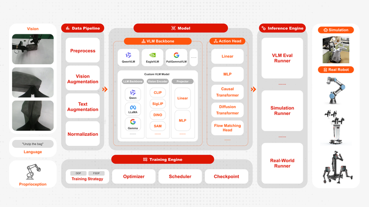 2026 年 04 月16 日,逐际动力(LimX Dynamics)正式宣布,开源面向具身智能科研创新、应用开发与落地的FluxVLA Engine,以统一配置、标准接口、模块解耦、加速部署为核心设计理念,打造标准化 VLA 工程底座,打通数据处理、模型训练、仿真评测到真机部署全流程,大幅降低具身智能全研发周期的工程门槛。当前具身智能向真实世界落地的过程中,行业普遍面临三大结构性瓶颈:数据格式碎