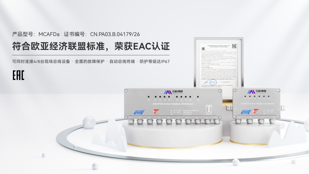 一、认证加持|顺利通过EAC认证 近日,沈阳中科博微科技股份有限公司(Microcyber Corporation)自主研发的MCAFD系列有源现场总线分配器(MCAFD4,MCAFD8),凭借卓越的产品性能和可靠的品质,正式获得欧亚经济联盟EAC认证。这一认证的获得,标志着产品在电磁兼容性方面完全符合TR CU 020/2011《技术设备电磁兼容性》 法规要求,获得了自由进入俄罗斯、白俄罗斯、哈