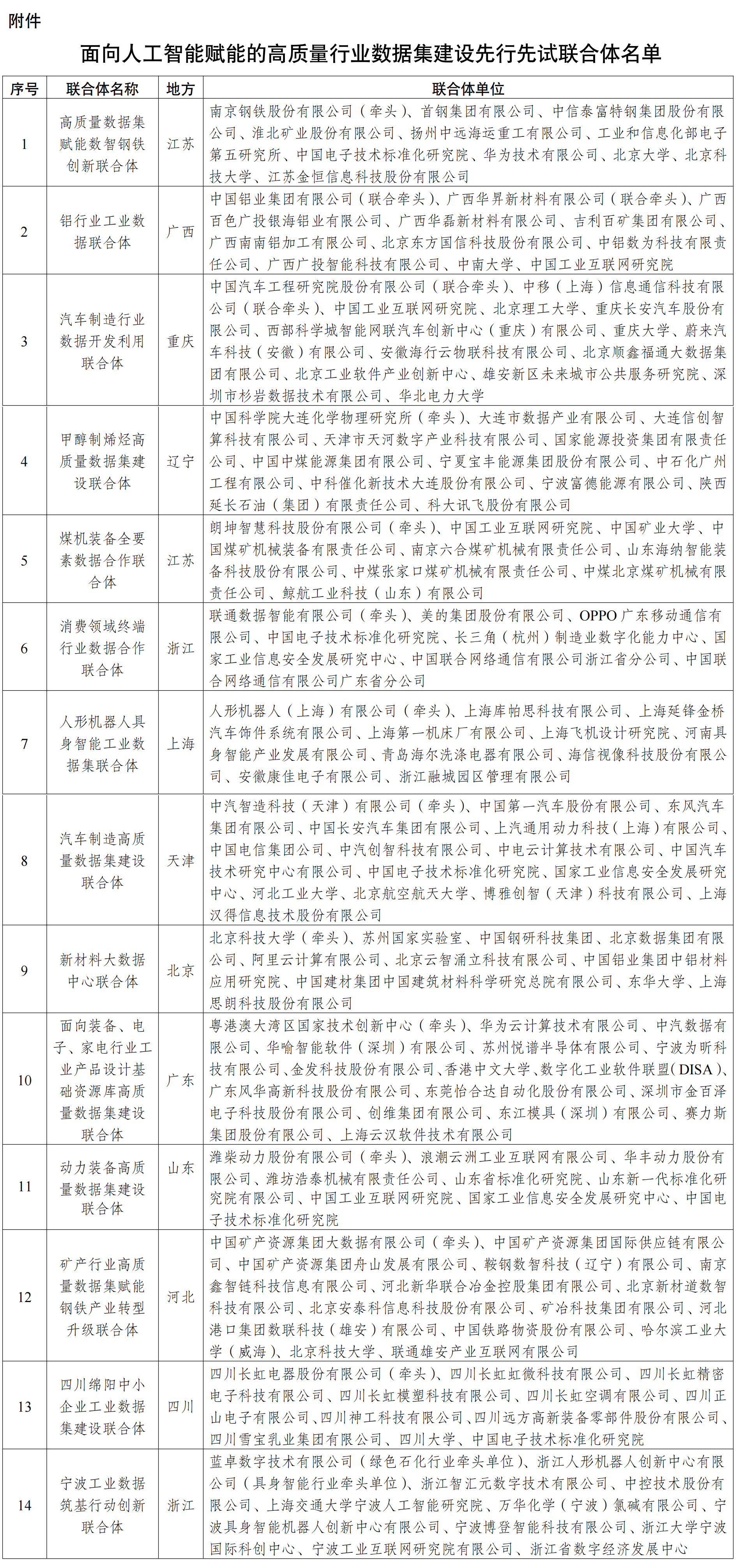关于公布面向人工智能赋能的高质量行业数据集建设先行先试联合体名单的通知 工信厅信发函〔2026〕138号 各省、自治区、直辖市工业和信息化主管部门: 为贯彻落实党中央、国务院关于人工智能发展的决策部署,加快探索工业数据“采”“集”“用”有效路径,按照《工业和信息化部办公厅关于启动工业数据筑基行动 开展面向人工智能赋能的高质量行业数据集建设先行先试的通知》(工信厅信发函〔2026〕64号)安排,经地