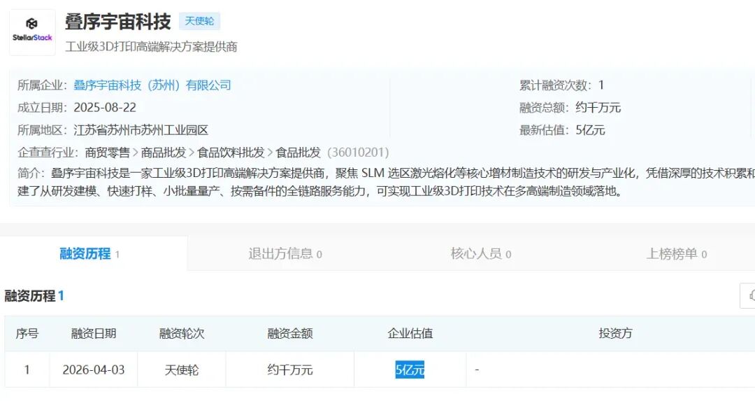 南极熊导读:金属3D打印赛道又添新成员。2026年4月7日,南极熊获悉,叠序宇宙科技(StellarStack)宣布完成千万级人民币天使轮融资,投后估值达5亿元人民币。本轮融资由多家机构联合投资,资金将主要用于核心技术迭代与工艺优化、商业化团队拓展及标杆客户市场深耕,为叠序宇宙工业级3D打印技术的规模化商业化落地奠定坚实基础。叠序宇宙是国内专注于工业级金属3D打印的高端解决方案提供商,聚焦SLM(