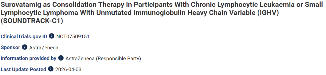 ▎Armstrong2026年4月3日,阿斯利康在Clinicaltrials.gov网站上注册了CD3/CD19双抗Surovatamig(AZD0486)治疗CLL/LL的三期临床试验SOUNDTRACK-C1。该三期临床计划入组420例CLL/SLL患者,预计2032年初步完成。AZD0486最初由Tenebio研发,2022年7月,阿斯利康以12.65亿美元收购TeneoTwo获得该CD3