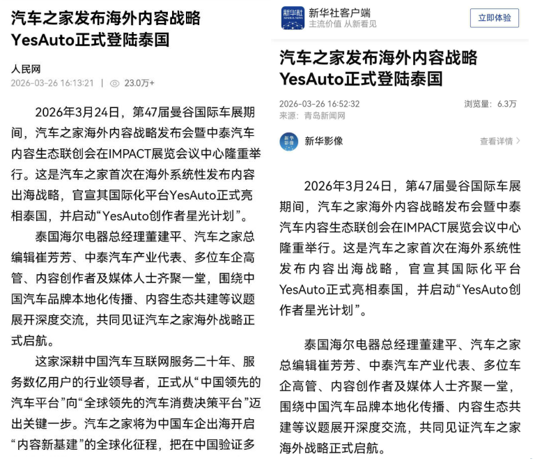 近日,围绕汽车之家“账号异常”“被禁止关注”等传闻在社交平台持续发酵,各种猜测甚嚣尘上。然而就在舆论热议之际,人民网、新华社接连报道汽车之家出海,却让这场风波呈现出另一种解读空间。 报道显示,3月24日,在第47届曼谷国际车展期间,汽车之家正式发布海外内容战略,其国际化平台YesAuto登陆泰国,并启动“创作者星光计划”。这是汽车之家首次在海外系统性布局内容生态,标志着这家国内头部汽车垂直平台正加