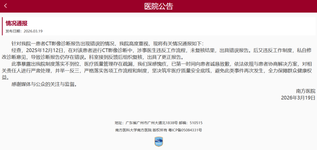 医院:深感愧疚,对相关责任人进行严肃处理!来源 | 南方医院网站、新京报3月19日,南方医院发布情况通报:针对我院一患者CT影像诊断报告出现错误的情况,我院高度重视,现将有关情况通报如下:经查,2025年12月12日,在对该患者进行CT影像诊断中,涉事医生违反工作流程,未复核结果,出具错误报告。后又违反工作制度,私自修改诊断意见,导致诊断报告仍存在错误。科室接到反馈后组织复核,出具了更正报告。此事