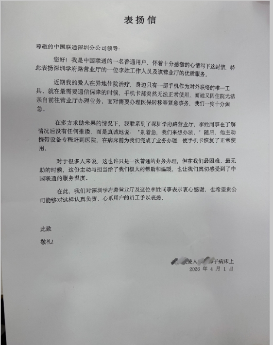 在深圳,中国联通以“人民邮电为人民”的初心使命,打造“联通AI满格”贴心服务,在业务员受理台、社区楼宇间、跨境口岸线,书写“数智为民,服务暖心”的城市故事,搭建起城市发展的“数字动脉”,更传递着民生温度。 病床前的“联通温度” “别着急,我们来想办法。”一句简单的承诺,撑起了用户在最无助时刻的希望。近日,中国联通南山学府营业厅接到一位异地用户的紧急求助,用户家属在深圳住院治疗,手机卡突然故障失去联