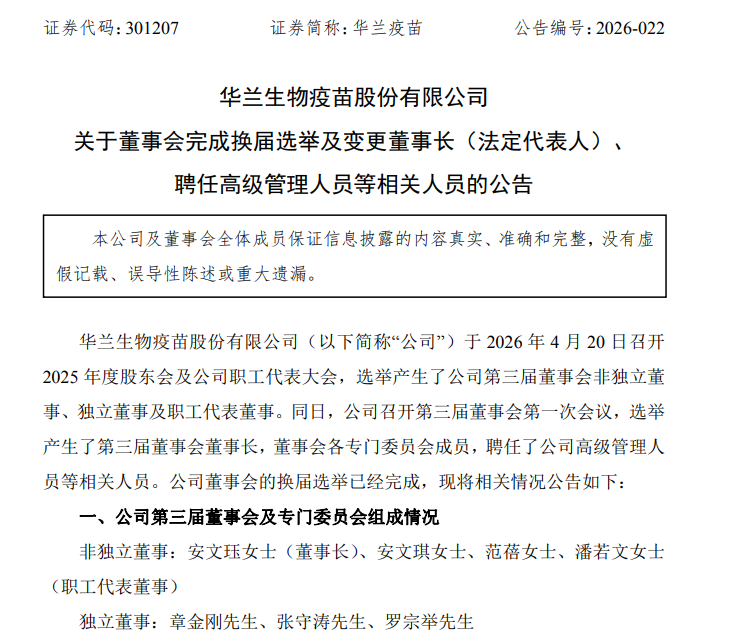 转自:企业公告 综合:无忧4月21日,华兰疫苗发布重磅公告,现年37岁的安文珏女士正式当选为公司第三届董事会董事长,并出任法定代表人。这一人事变动绝非简单的新老交替,更标志着这家百亿市值的疫苗龙头企业,正式迈入“85后”掌舵的全新发展阶段。作为华兰系创始人安康的女儿,安文珏的接棒,既是家族企业传承的自然延续,更是华兰疫苗在疫苗行业格局深刻调整期,寻求高质量发展与破局突围的关键一步。这一变化不仅关乎