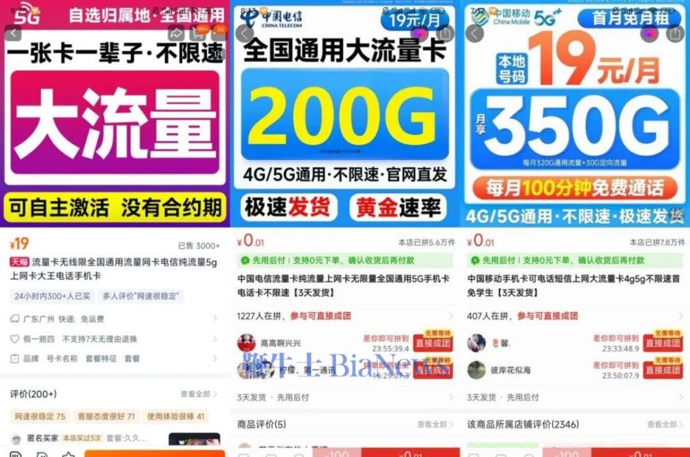 近日,号称“一分钱领卡、超低月租、收货地即归属地”的大额流量卡,正在各电商平台畅销。《BUG》栏目发现,在包括抖音、淘宝等电商平台搜索“流量卡”,有出现大量售卖该产品的商家,且月销量往往过千。这类商家主要用两种方式“套路”消费者,导致其往往到货后才发现“货不对板”:第一,用小金额“诱导宣传”。商家产品页面上,“200G”“19元/月”等字眼十分显眼。但所谓价格并非实际费用,而是在综合各种优惠、折扣