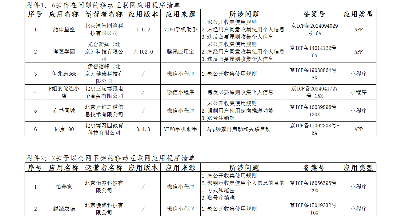 为贯彻落实工业和信息化部相关部署和工作要求,依据《中华人民共和国网络安全法》《中华人民共和国数据安全法》《中华人民共和国个人信息保护法》《电信条例》《电信和互联网用户个人信息保护规定》等法律法规,北京市通信管理局持续开展移动互联网应用程序隐私合规专项整治。一、近期,我局通过抽测发现本市部分移动互联网应用程序存在“违反必要原则收集个人信息”“未明示收集使用个人信息的目的、方式和范围”等侵害用户权益问