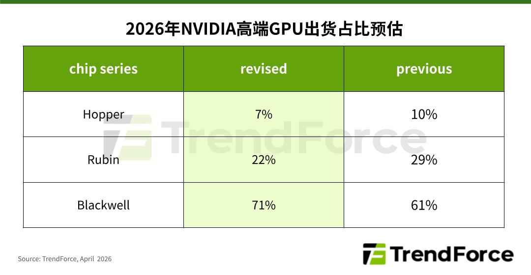 TrendForce集邦咨询: 供应链尚需调校增添Rubin延迟风险,2026年Blackwell将占英伟达高端GPU出货量超7成 根据TrendForce集邦咨询最新AI Server产业调查,2026年NVIDIA(英伟达)的高端AI芯片出货结构将出现变化,受到国际形势变化、供应链仍需时间调校等因素影响,预估Hopper、Rubin系列占其整体高端GPU出货比例将下降,进而推升Blackwel