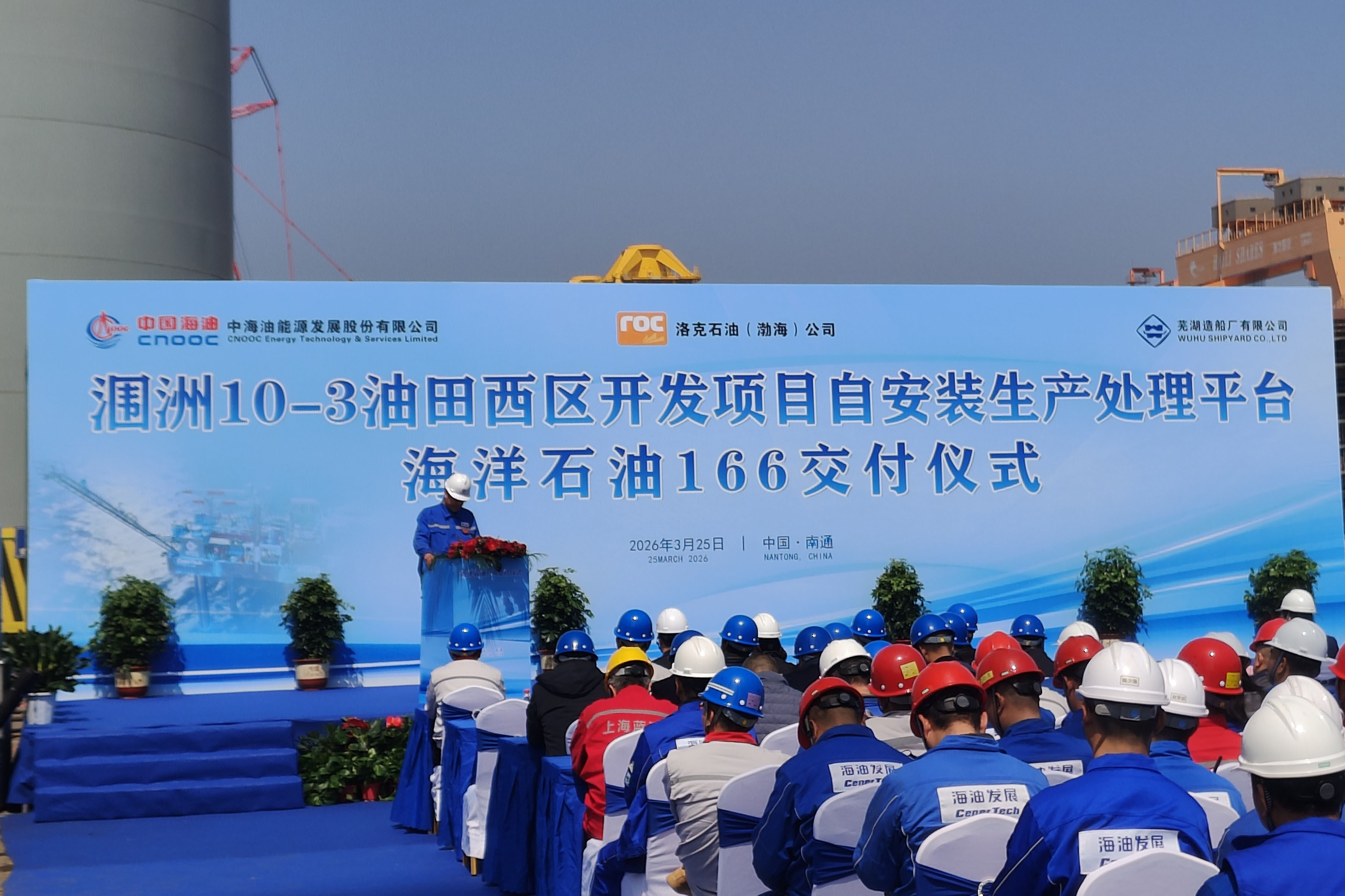 近日,蓝科高新参与建设的涠洲10-3油田西区开发项目自安装生产处理平台“海洋石油166”交付及拖航仪式在南通举行。海南矿业、南通市政府、芜湖造船厂、海油发展等合作方及相关单位的领导出席仪式,蓝科高新党委委员、副总经理张尚文参加活动。该设施的顺利启航标志着项目从陆上建造全面转入海上安装与投产准备阶段,为我国海洋油气资源的增储上产注入新动力。“海洋石油166”平台是我国迄今同类移动式海洋石油生产装备中