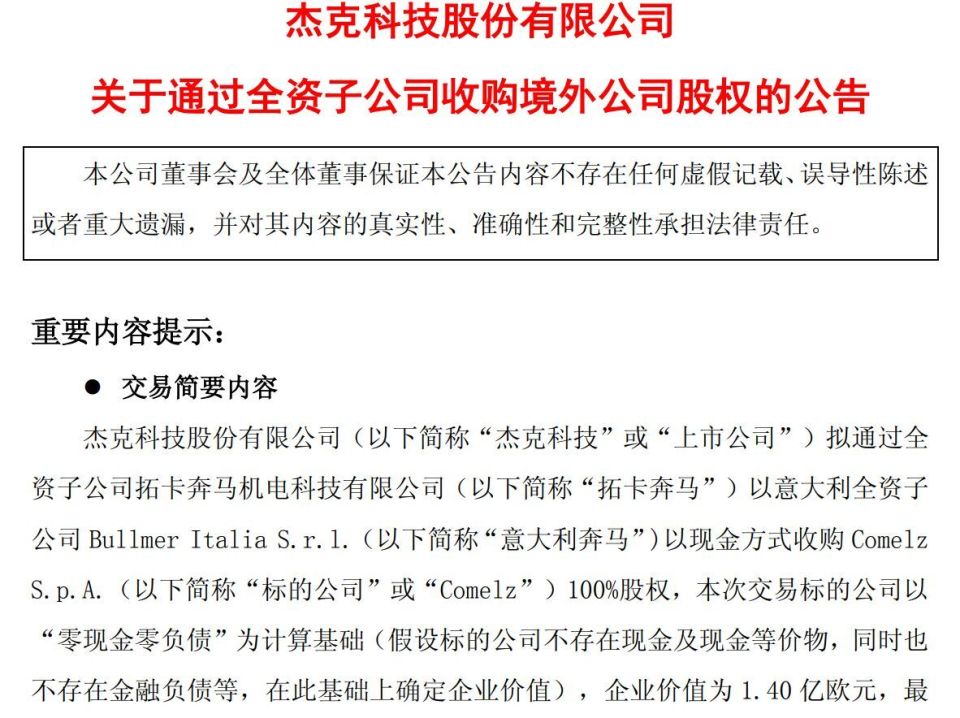 每经记者:文多 每经编辑:魏文艺A股缝制设备龙头杰克科技(SH603337,股价40.32元,市值192.09亿元)的全球化版图再添一块拼图。4月22日晚,杰克科技公告称,计划通过其全资子公司,以约1.16亿欧元(按当前汇率约合人民币9.29亿元)的现金对价,收购意大利公司Comelz S.p.A.(以下简称“Comelz”)的100%股权。此次交易标的的企业价值被定为1.40亿欧元(按当前汇率约