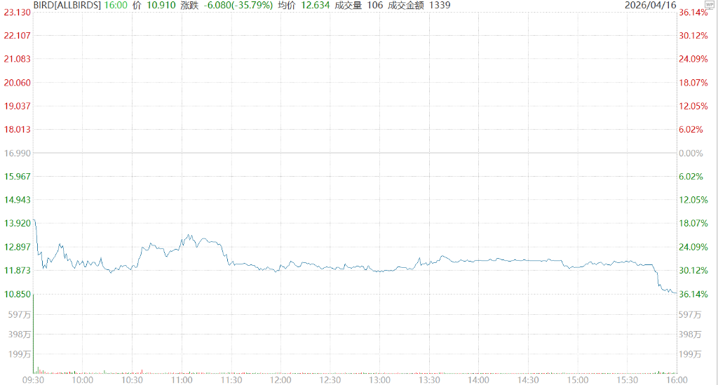 Allbirds的"AI转型"行情来得快,去得也快。 4月16日周四,“硅谷足力健”Allbirds大幅下挫近36%,盘后继续下挫超6%。此前因转型人工智能基础设施,周三股价狂飙逾582%。 华尔街见闻提及,以羊毛运动鞋起家的公司Allbirds,宣布更名为NewBird AI。此前分析师对飙升普遍持怀疑态度,认为不过是AI热潮下的情绪宣泄。 50 Park Investments首席执行官Ada