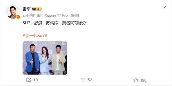快科技3月20日消息,今天上午,小米创办人雷军在社交媒体上感慨,小米SU7与代言人舒淇、苏炳添之间有着一种莫名的缘分。 早在两年前第一代SU7发布时,就有众多米粉提议邀请舒淇代言,理由便是极具趣味性的谐音梗。在新一代小米SU7的发布会上,舒淇如约出现在现场,正式成为该系列车型的代言人。她表示非常荣幸能与小米合作,并在亲身体验新车后给出了极高的评价,认为新一代产品的整体感受非常出色。 除了舒淇,亚洲