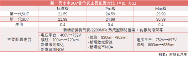 3月19日,小米汽车正式发布新一代小米SU7,三个版本售价分别为21.99万、24.99万和30.39万元,较第一代SU7价格分别上涨4000元,但较之前预售价降一万元。 “(新一代SU7)升级的地方超过了100多项,光材料成本就增加了小2万元。但考虑到购置税政策退坡后,我们不想让买新一代SU7的车主超过预算。”小米集团董事长雷军在发布会后解释了此次新车定价的逻辑。 新一代SU7搭载全域碳化硅高压