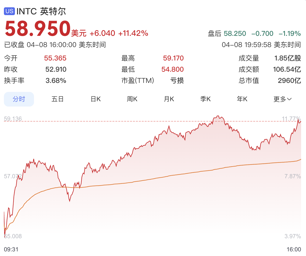 界面新闻记者 | 宋佳楠 美东时间4月8日,老牌芯片巨头英特尔股价以11.42%的涨幅收盘于58.95美元,创下自2021年4月以来的最高水平,单日市值激增超290亿美元,总市值达2960亿美元。 英特尔股价大涨的直接原因是该公司近期宣布加入马斯克主导的Terafab超级芯片工厂项目。在科技行业面临芯片产能重构与AI算力竞赛的关键节点,这一合作引发了市场对全球半导体产业格局的重新审视。 此次英特尔