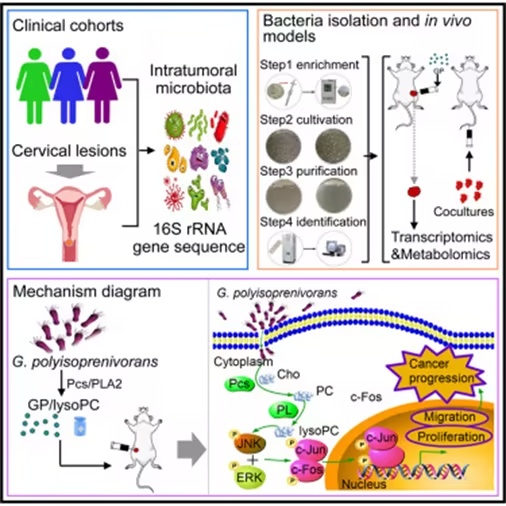 本研究采用16S rRNA 测序对与宫颈癌进展相关的肿瘤内微生物群进行表征,并建立了从肿瘤组织中分离细菌菌落的实验流程。研究鉴定出戈登氏菌属(Gordonia)—其中聚异戊二烯戈登氏菌(G. polyisoprenivorans)是驱动宫颈癌进展的关键菌株。机制上,由聚异戊二烯戈登氏菌产生的溶血磷脂酰胆碱(lysoPC)可诱导c‑Jun与c‑Fos 的表达及磷酸化,进而促进癌细胞增殖与迁移。