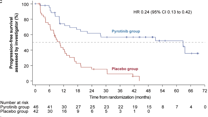 其次,吡咯替尼联合治疗方案延缓了首次脑转移的发生时间。最新数据显示,吡咯替尼组与安慰剂组患者的首次脑转移发生时间中位数分别为16.6个月和9.1个月,吡咯替尼的加入将首次脑转移发生时间延缓了7.5个月1。