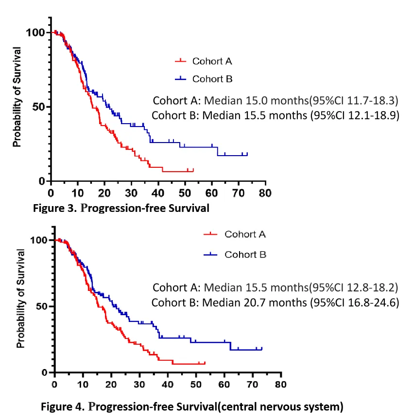 考虑到队列B入组人群为脑转移放疗后再进展的患者,其疗效受到多方面因素的影响,且该队列入组患者数量未达预设要求,因此数据仅供参考。该队列的颅内客观缓解率为42.1%,中位颅内PFS为5.7个月,中位OS为30.6个月3。
