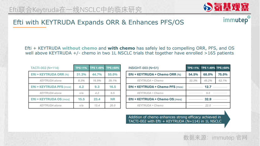 在针对头颈鳞状细胞癌的TACTI-003研究中,efti在PD-L1阴性患者的治疗潜力再次被验证。整体上,efti联合K药组合ORR达到32.8%,对比K药单药26.7%显著提高,而在K药不适用的阴性患者人群,联合用药ORR也达到了26.9%。