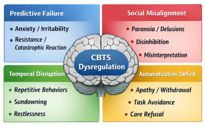 将BPSD放入CBTS框架,最大的理论收益在于:它不再只是零散症状的堆积,而成为一个具有层级结构的网络表型。传统分类倾向于把妄想归精神病性、把激越归行为性、把冷漠归情感性、把游走归运动性;但临床现实中,这些症状往往缠绕出现,并受环境噪声、照护方式、任务复杂度和社交压力显著影响。CBTS模型则指出,这种“缠绕性”恰恰来自它们共享了一个更上游的失稳层:行为调谐后台。