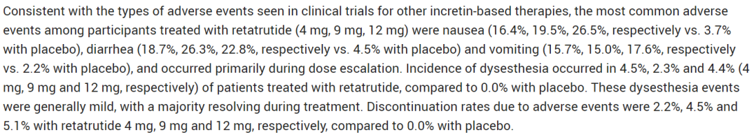 Retatrutide 4mg、9mg、12mg剂量组和安慰剂组治疗40周,HbA1c分别降低1.7%、2.0%、1.9%、0.8%,体重分别减轻11.5%、15.5%、16.8%、2.5%,安慰剂校正后体重分别减轻9.0%、13.0%、14.3%。