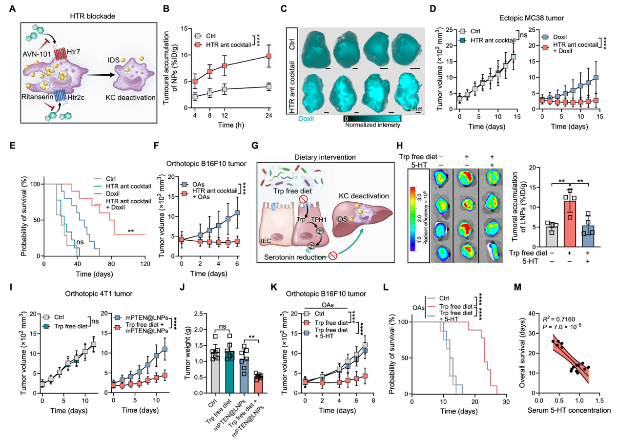 实验证实,干预血清素通路或通过饮食调控限制色氨酸摄入,均可显著抑制肝脏Kupffer细胞对递送载体的清除活性,使肿瘤递送效率提升2倍至3倍、靶组织基因编辑效率提升10倍至15倍,在多种疗法等模型中均实现显著疗效提升。