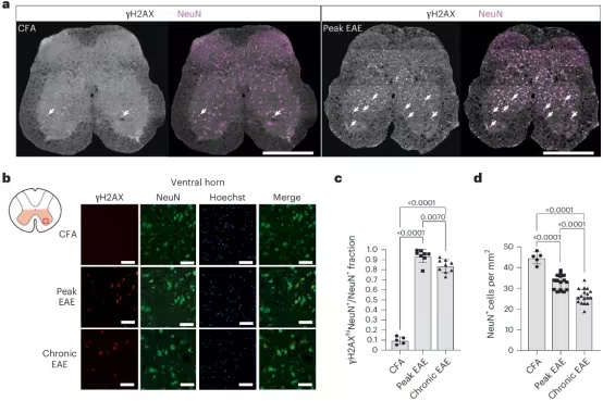 "在 EAE 模型中,我们结合使用大脑和脊髓组织的转录组分析以及免疫荧光技术,检查了炎症高峰期和晚期时间点神经元和神经胶质细胞中的信号。"Calabresi 解释道。