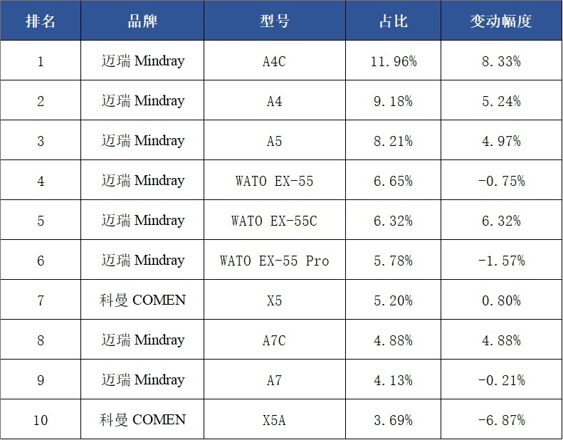 从具体型号上看,排名前三的型号分别来自迈瑞的A4C、迈瑞的A4和迈瑞的A5。