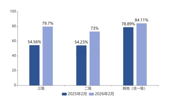 从医院品牌国产化率来看,2026年2月三级医院本土品牌占比为79.70%,较去年同期上升25.14%;二级医院本土品牌占比为73.00%,较去年同期上升18.77%。