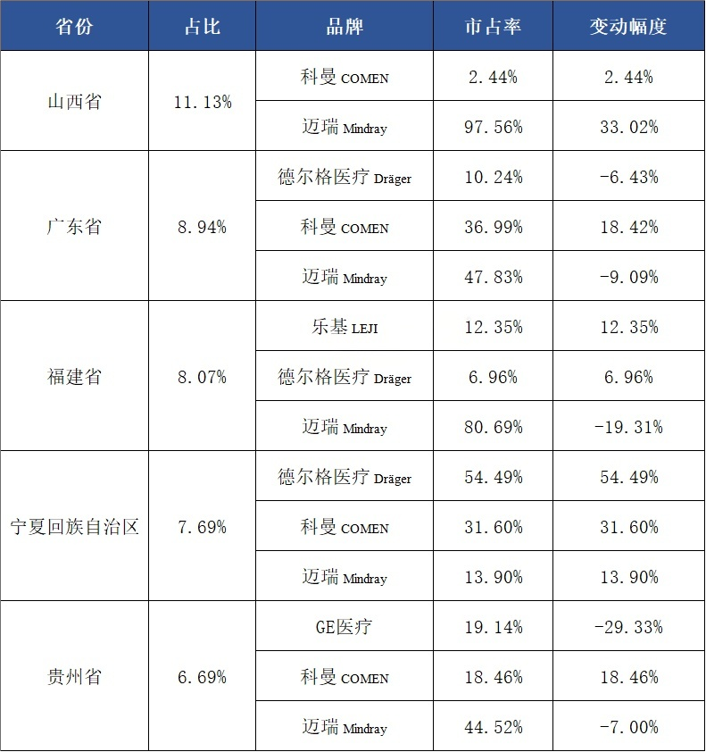 从各省份品牌来看,前五省份的品牌主要以迈瑞、科曼为主。