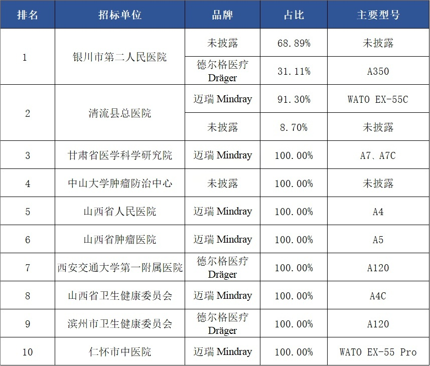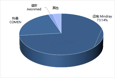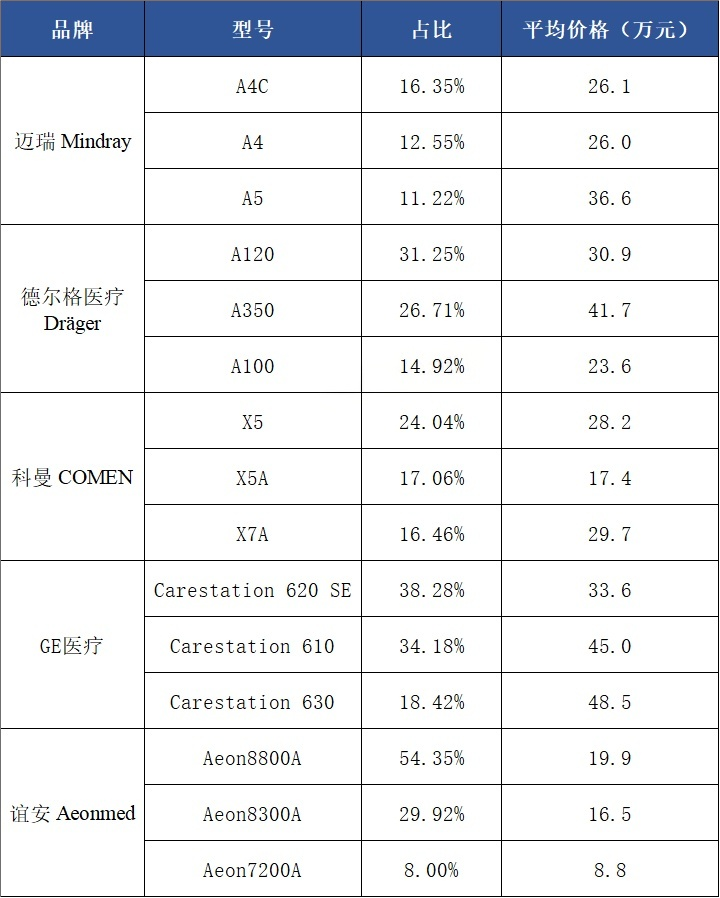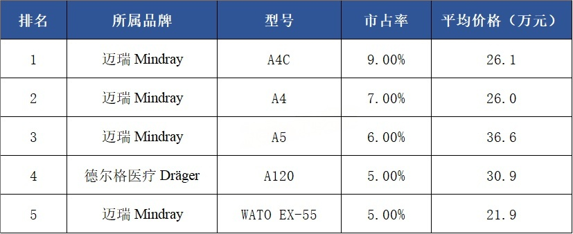 从各品牌主流型号来看,迈瑞前三型号市占率之和占该品牌市场总额的40.13%;德尔格医疗前三型号市占率之和占该品牌市场总额的72.88%;科曼前三型号市占率之和占该品牌市场总额的57.56%;GE医疗前三型号市占率之和占该品牌市场总额的90.88%;谊安前三型号市占率之和占该品牌市场总额的92.27%。