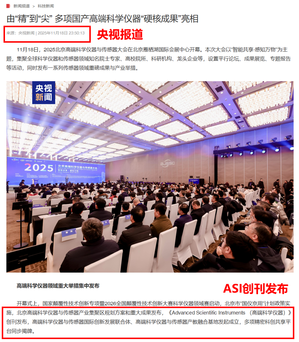 ASI 的创办不仅在学术界引发热烈反响,也获得了国家级媒体的高度关注。2025年11月18日央视网的深度报道中,Advanced Scientific Instruments 的创刊发布,作为“高端科学仪器领域重大举措”之一,与国家颠覆性技术创新专项、北京市“国仪京用”计划等产业政策同台发布。