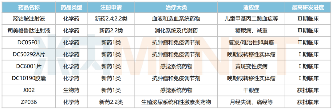 8款在研新药中,化药2类新药羟钴胺注射液(儿童甲基丙二酸血症)和司美格鲁肽注射液(糖尿病)已步入Ⅲ期临床,化药1类新药DC05F01(卵巢癌)已步入Ⅱ期临床,申报NDA指日可待;化药1类新药DC50292A片(实体瘤)、DC6001片(黄斑变性疾病)和DC10190胶囊(实体瘤)正处于Ⅰ期临床,生物药1类新药J002(干眼症)、化药2.2类新药ZP036(月经失调、痛经)均已获批IND。
