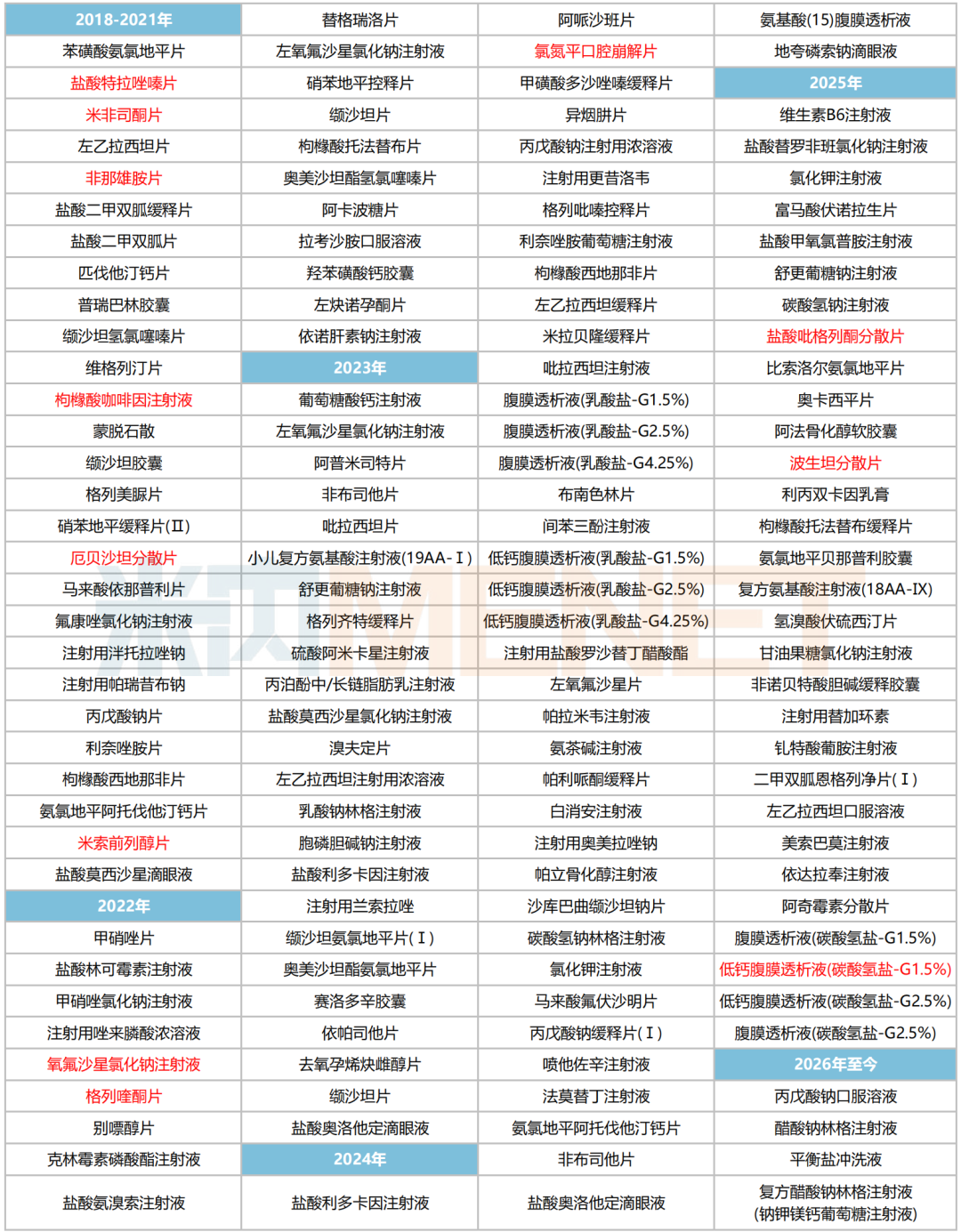 从剂型上看,注射剂和片剂为主力军,分别有超50个产品在列;按治疗大类统计,神经系统药物、消化系统及代谢药、心脑血管系统药物、血液和造血系统药物、全身用抗感染药物五大品类各占20个及以上席位。