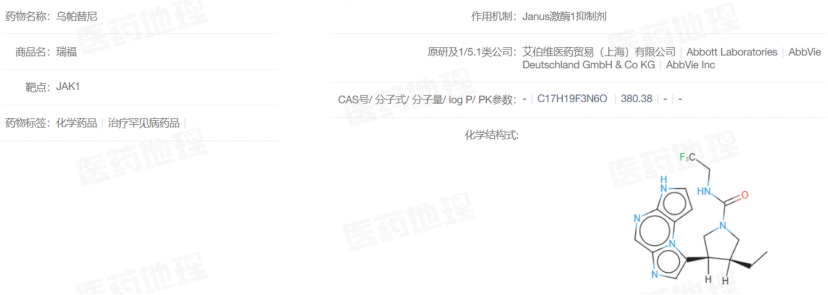 Pharma ONE药物研发大数据平台显示,目前乌帕替尼已在国内获批溃疡性结肠炎、克罗恩病、银屑病关节炎、特应性皮炎、强直性脊柱炎、类风湿关节炎等多项适应症。